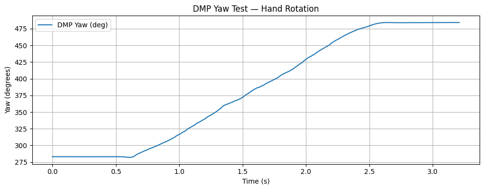 DMP yaw during a hand rotation test. No PID, just verifying the sensor tracks correctly.