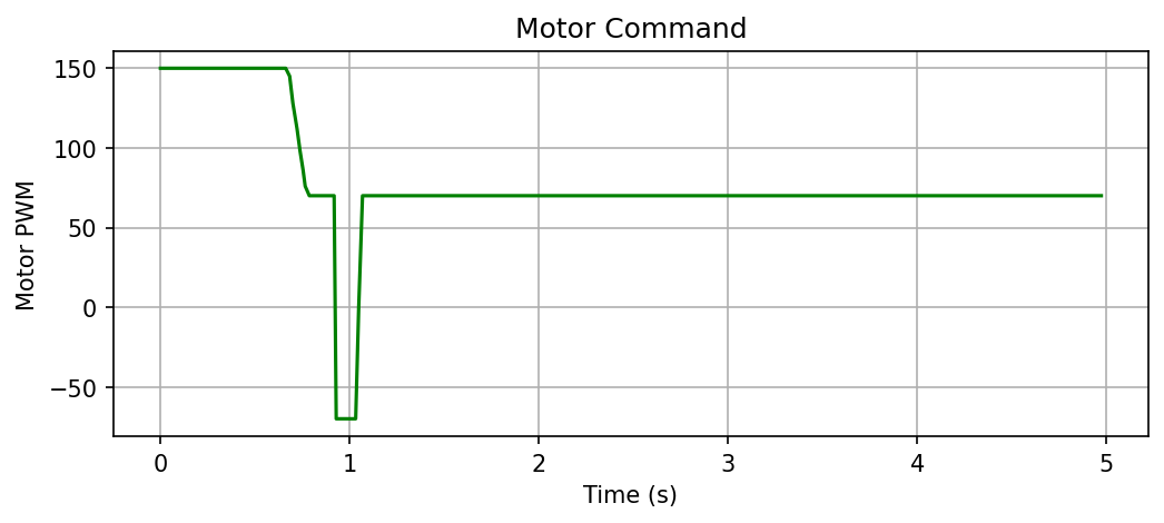 Motor command for 180 degree trial. Briefly reverses when it overshoots, then holds at deadband trying to close the remaining gap.