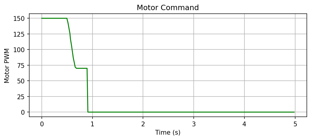 Motor command for 90 degree trial. Starts at max PWM, drops through deadband, then cuts to 0 inside the dead zone.